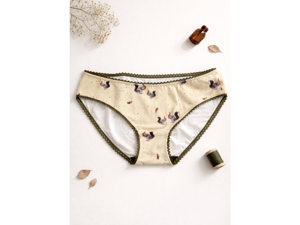 Originální potisk s veverkami a ladící lemovací gumička. Klasický střih kalhotek s vnitřní vrstvou z bambusu.